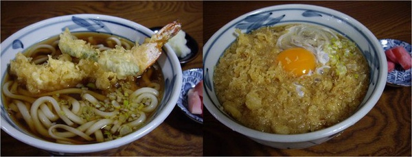 各點了一碗"炸蝦烏龍麵"跟"炸糊生蛋簥麥麵"